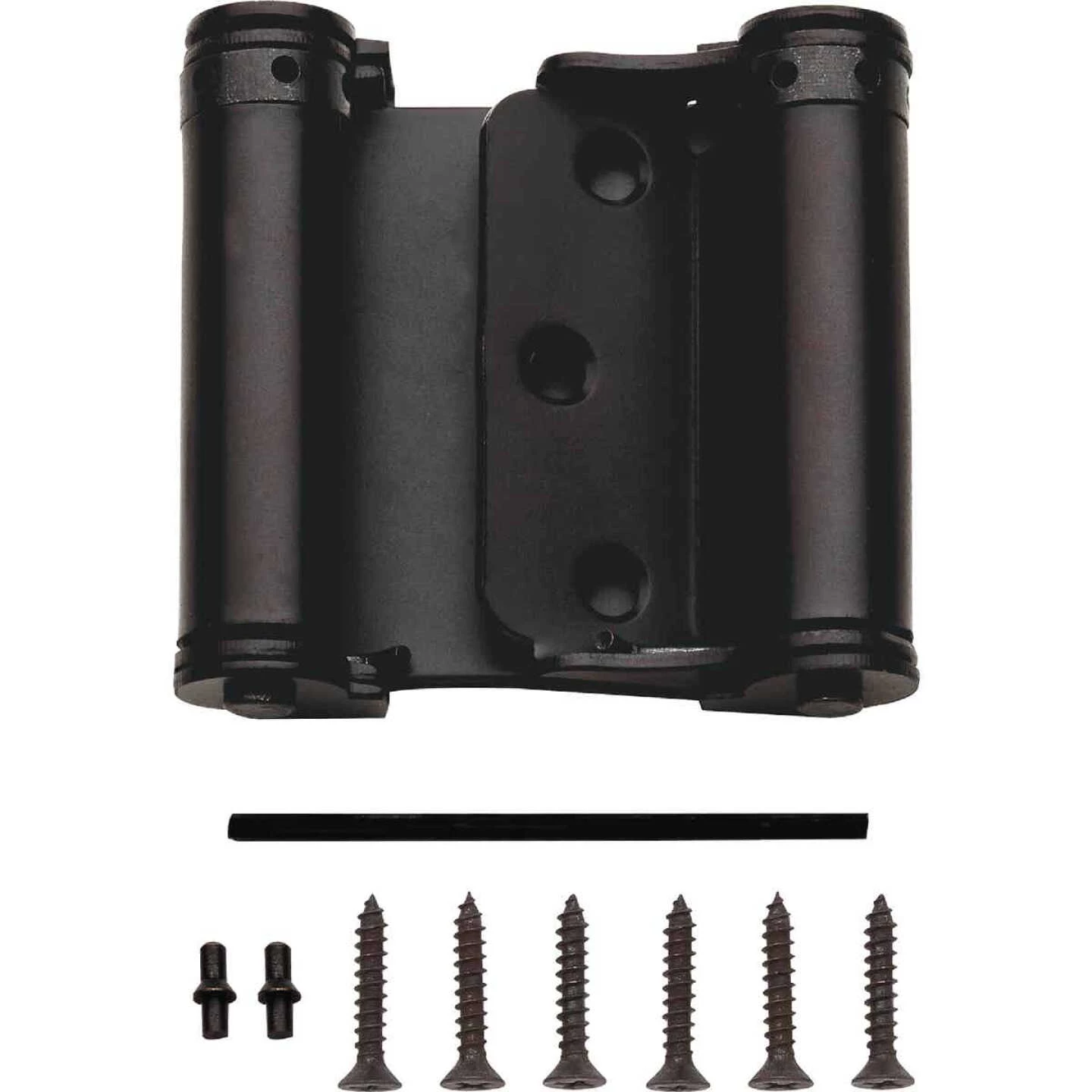 National catalog model No. V127 double-acting spring hinges. Double action, self closing, provides 2-way access for swinging doors. Tight pin is adjustable to provide desired closing speed for a variety of swinging-door applications. Screws included. Cold-rolled steel hinge.