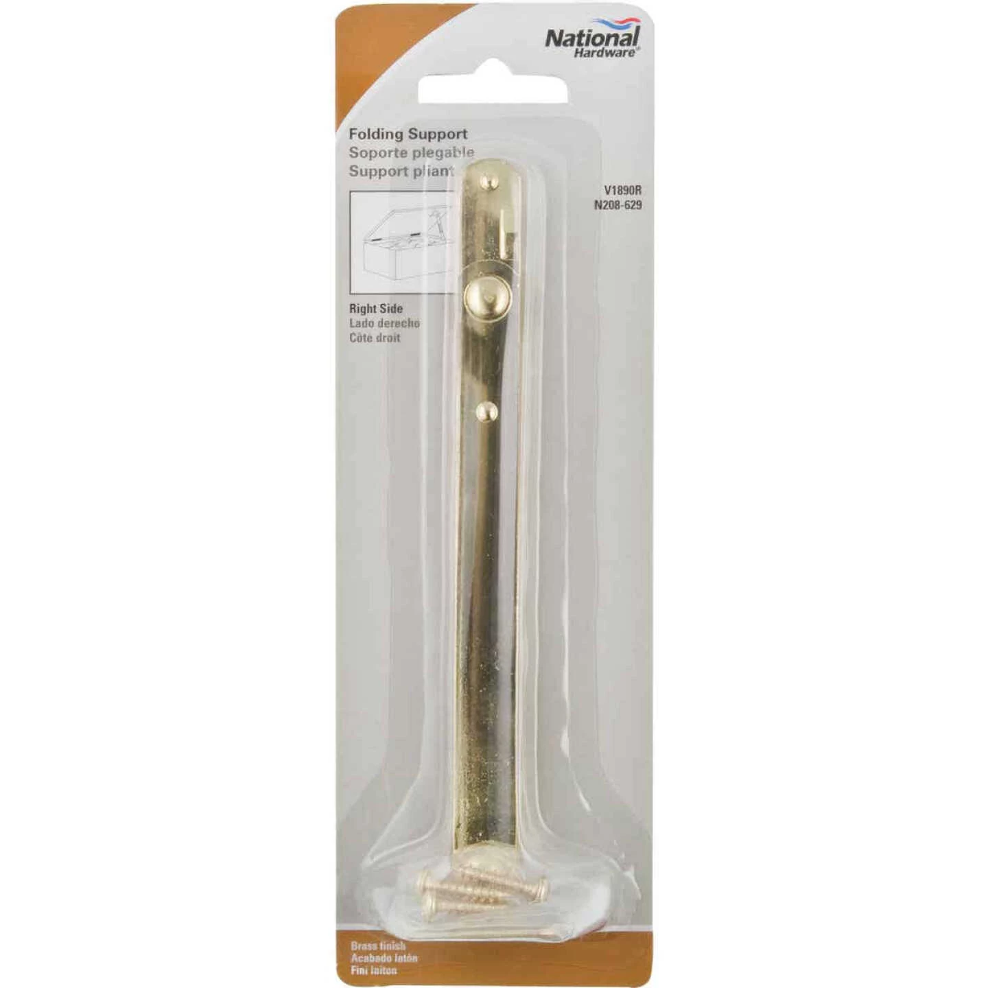 National catalog model No. V1890. Designed to support table legs, shelves, chest lids, and more. Prevents lid from slamming. Made of steel. Brass finish.