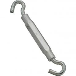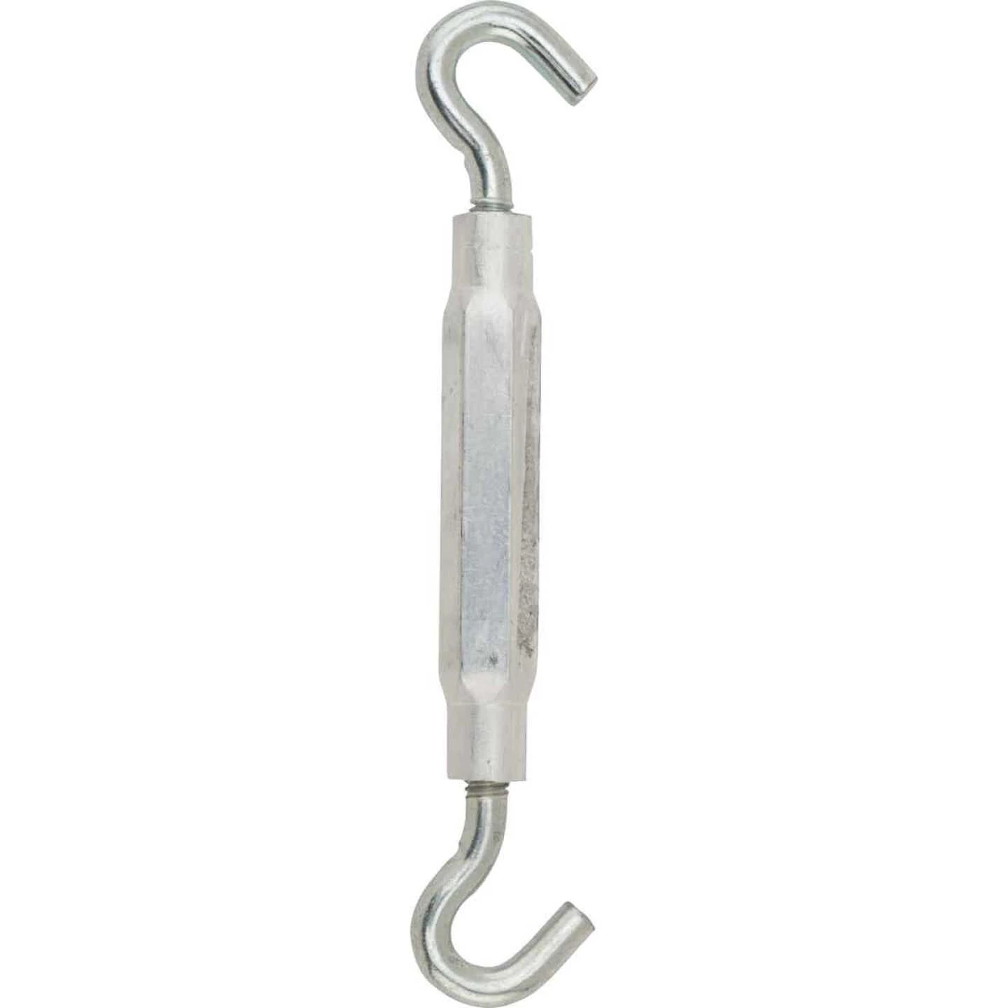 National catalog model No. 2174BC hook/hook turnbuckle zinc plated. Designed for tightening or drawing together various lines and cables. Hex body allows for ease of adjustment by hand or with a wrench. Steel wire hook on both ends. Extruded aluminum body.