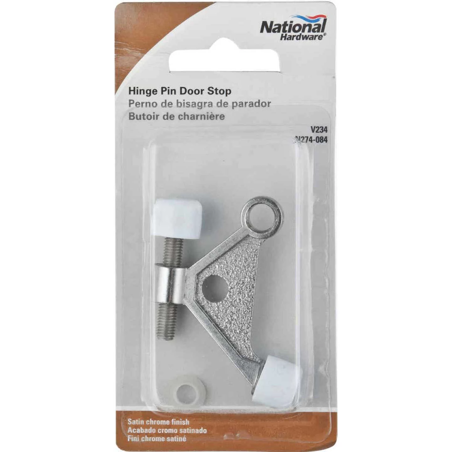 National catalog No. V234. Die-cast zinc. Mounts easily on door hinges by removing hinge pin, sliding stop over the pin and reinserting the pin in the hinge. Adjusts without tools to control how far the door opens. 1-7/8″ projection.