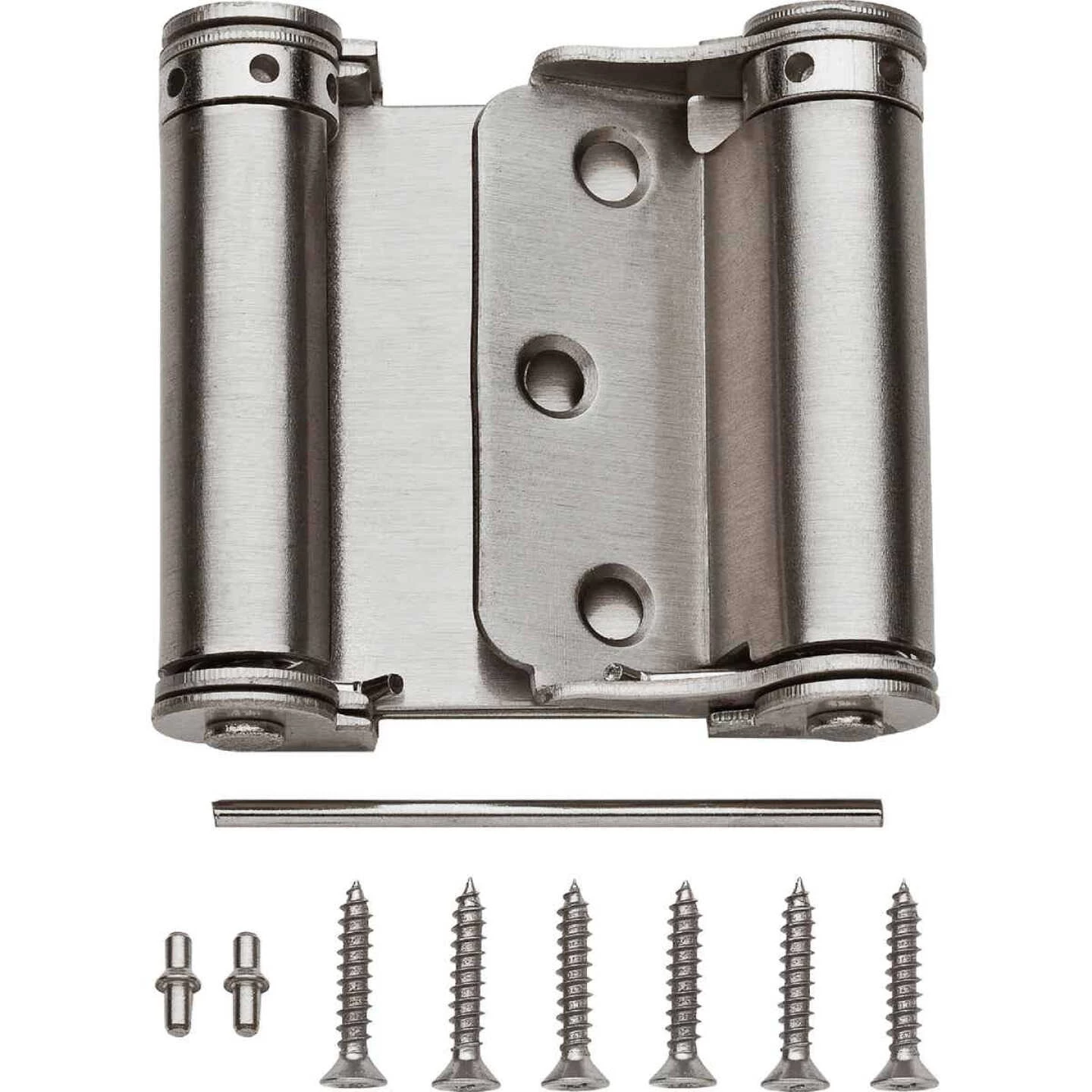 National catalog model No. V127 double-acting spring hinges. Double action, self closing, provides 2-way access for swinging doors. Tight pin is adjustable to provide desired closing speed for a variety of swinging-door applications. Screws included. Cold-rolled steel hinge.
