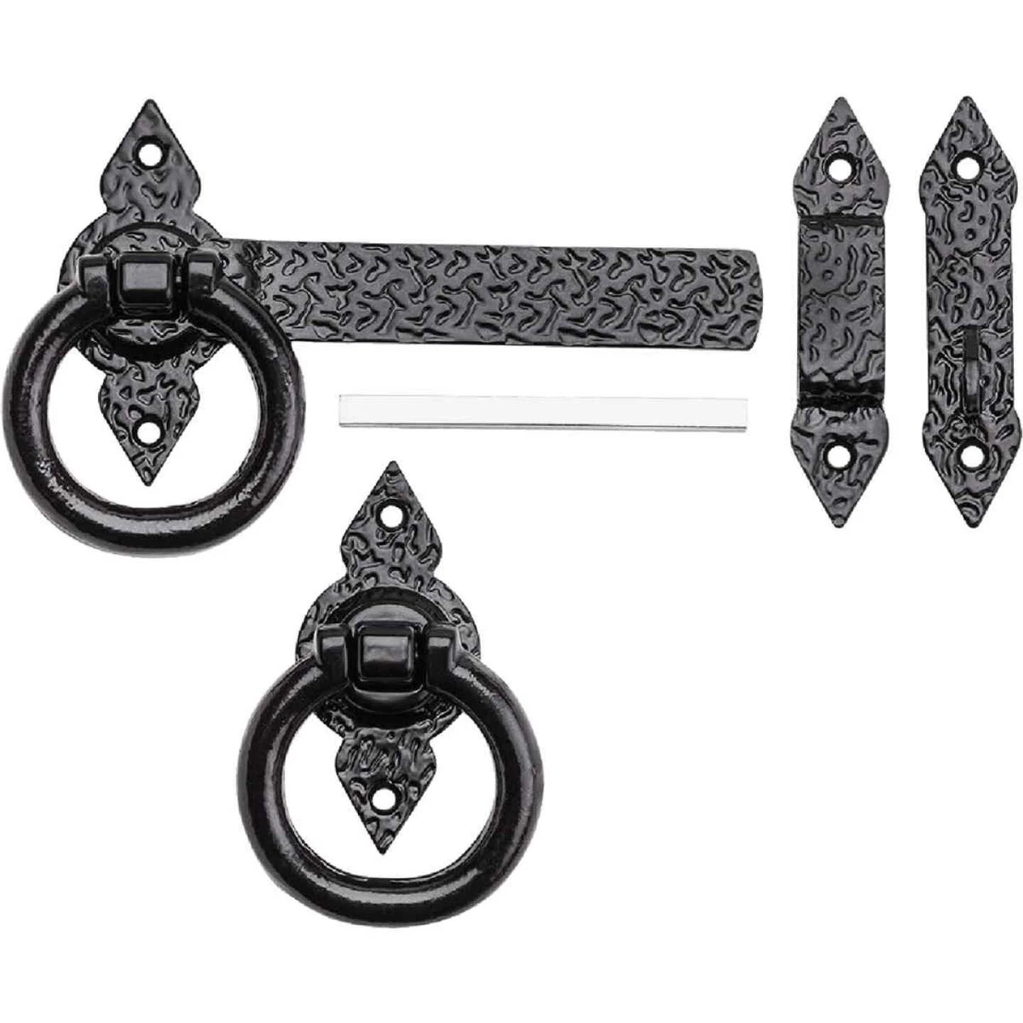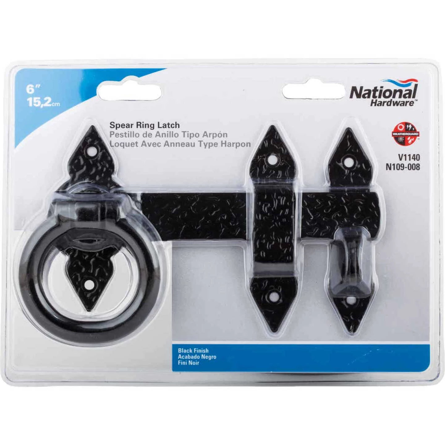 National catalog model No. V1140 Spear Ring Latch, black. Decorative Spear design and with decorative material. Surface mount application for use on gates, sheds and doors. Easily open latch from other side with included ring. Fits door/gate thickness 2 In. to 3-1/2 In. thick. 5/16 In. key stock can be purchased separately and cut to length for thicker doors.