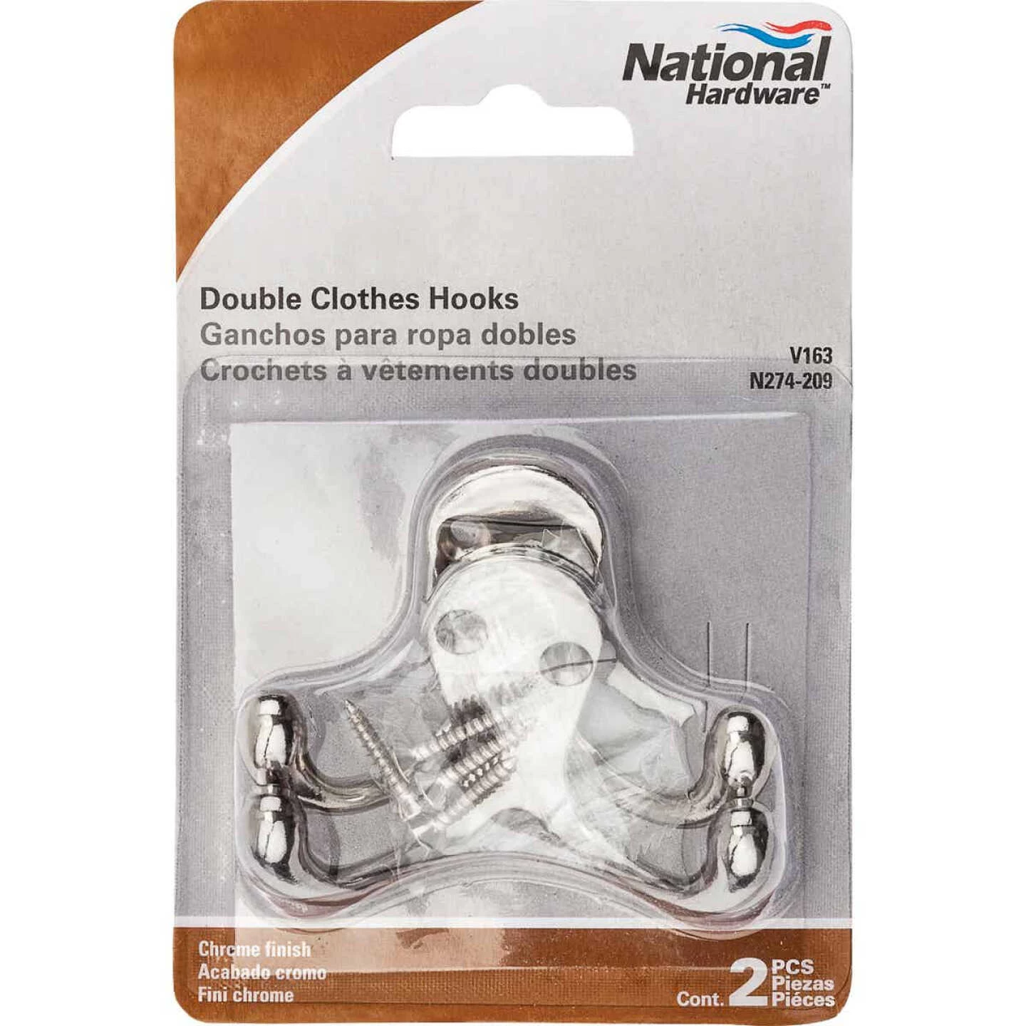National catalog model No. V163 double clothes hook, chrome. Designed for use in bedrooms, bathrooms, closets and more. Extra heavy for added strength. Decorative ball tip design. Manufactured of Zinc die-cast.