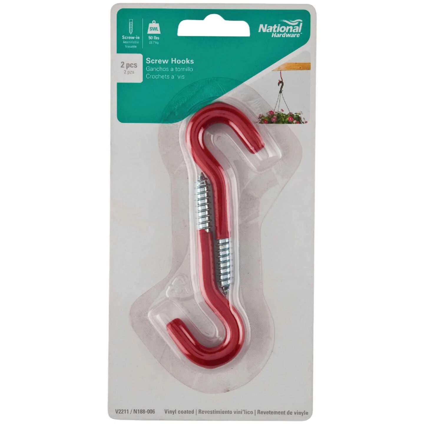 4-1/2″ x 5/16″ steel wire. Zinc-plated finish with a red vinyl coating. Designed to hold lawn and garden equipment, planter, lanters, clotheslines, etc. Safe working load 60 lb. Marproof vinyl coating helps prevent scratching. 2 per pack.