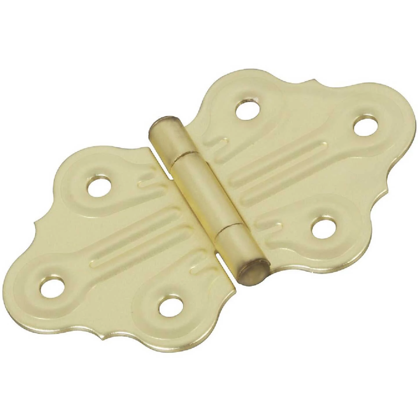 485. Cold-rolled steel embossed leaves. Smooth knuckles packed in a visual pack with 5/8″ x 5″ oval head screws. Full surface. Satin brass finish.
