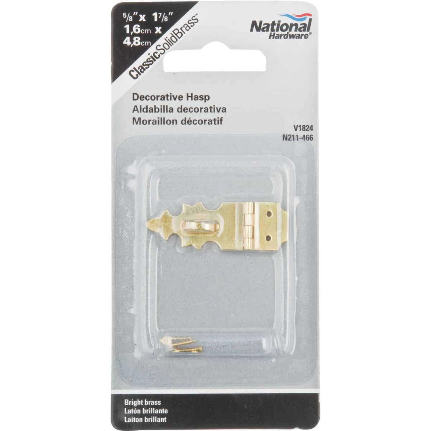 National catalog model No. V1824. Miniature brass. Designed to add a decorative appearance to small chests, jewelry boxes, craft projects, etc. Hasp style matches National’s model No. 1810, 1811, and 1816 decorative hinges. Can be used with national’s model No. 1880 padlock. Surface mount. Made of solid brass. Screws included. 1 per pack. Carded.