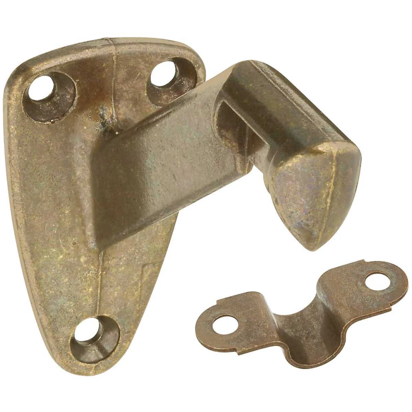 National catalog model No. V112 handrail bracket. Secures wooded handrail to wall, stud or other structurally sound surface. Bracket and strap are designed to adjust to any stairway angle. Maximum distance between brackets not to exceed 48 Inches. Zinc die-cast body and steel strap.