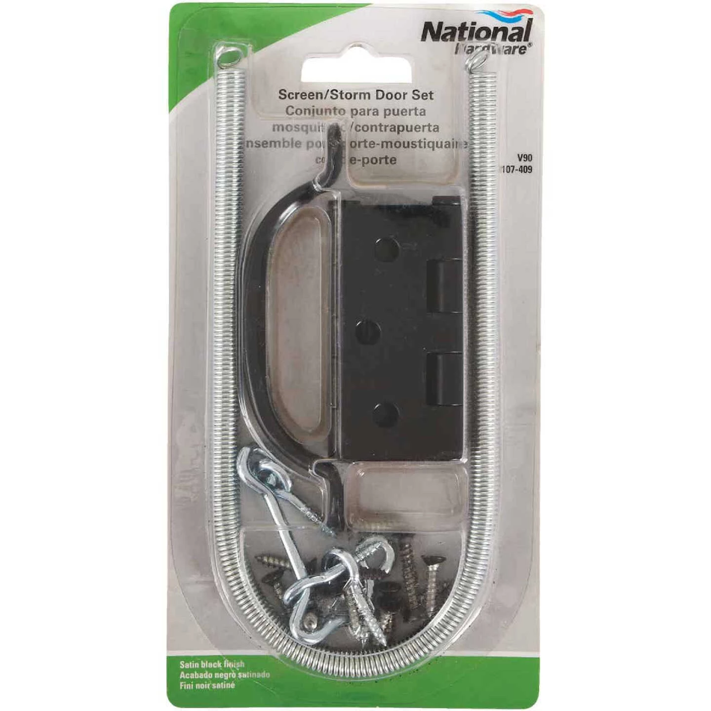 Designed for full-surface, half-surface, half-mortise, or offset application. Holes are countersunk on both sides. The pins are removable for easy door installation. Set consists of: 1 pair loose pin hinges, 3″ x 2-1/2″; 1 each zinc hook and eye, 2-1/2″, door pull, and 16-3/8″ National Hardware spring with hooks.