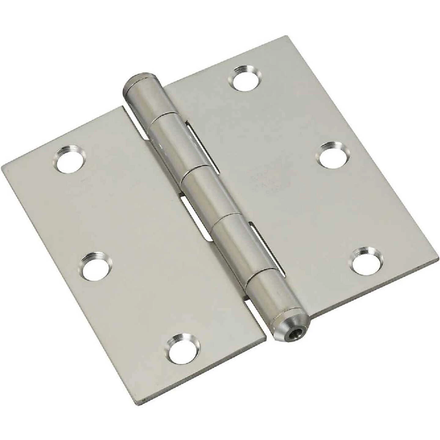 National catalog model No. V514 stainless steel door hinge. Stainless steel for maximum corrosion resistance. Nob on hinge for finished appearance. Square corners. Non-rising pin. Heavy-gauge material for added strength. 5 knuckle, full mortise design. Screw holes are countersunk. Removable pin for easier installation.
