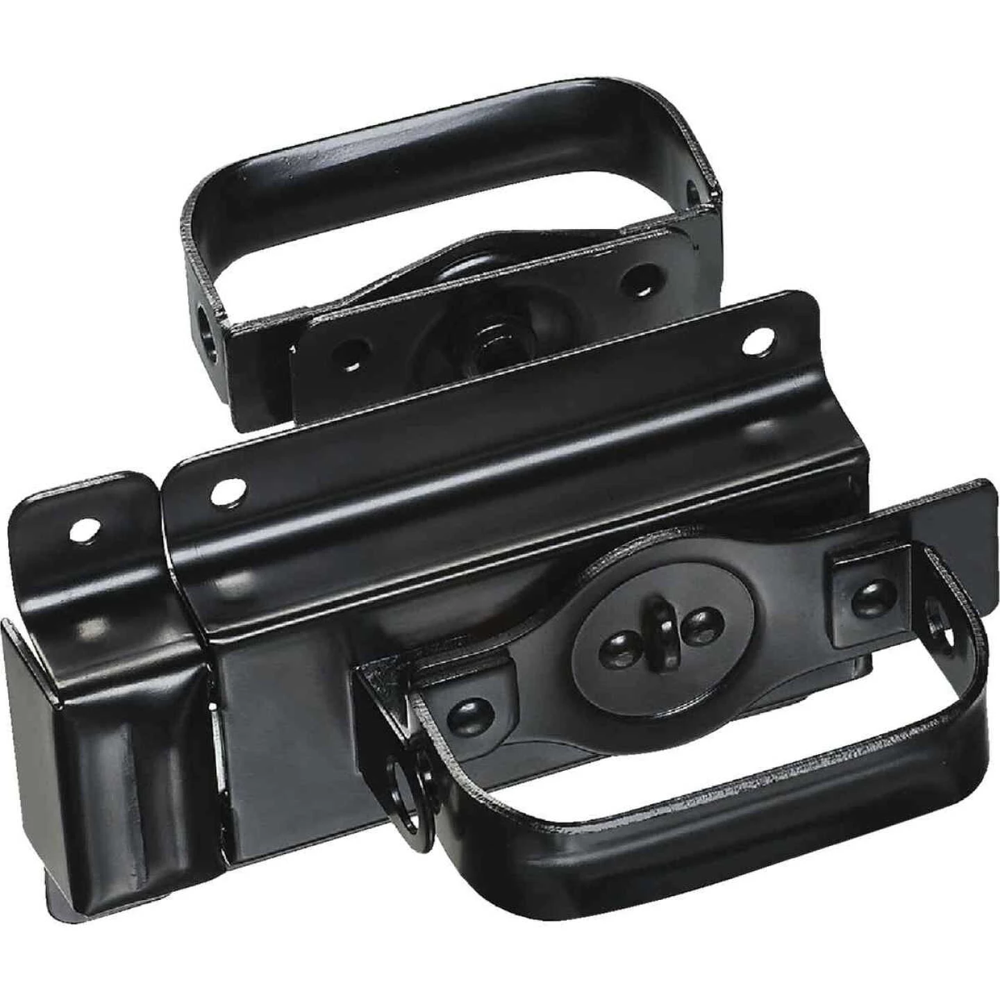 National catalog model No. SPB25 swinging door latch. A heavy-duty latch designed for swinging doors on storage sheds, barns, out-buildings etc. designed for right or left handed applications. Latched automatically. Can be padlocked for added security. Handle is designed to prevent flattening if door slams against building. Can be operated from wither inside or outside of door. Wide strike allows for door sag. Bolt has rounded face for easy latching. Bracket is provided to hold door open.