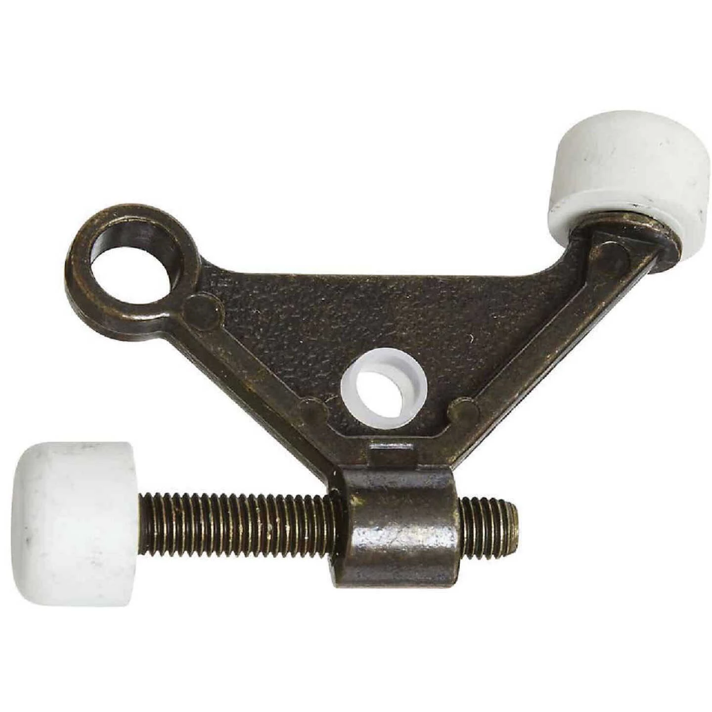 National catalog No. V234. Die-cast zinc. Mounts easily on door hinges by removing hinge pin, sliding stop over the pin and reinserting the pin in the hinge. Adjusts without tools to control how far the door opens. 1-7/8″ projection.