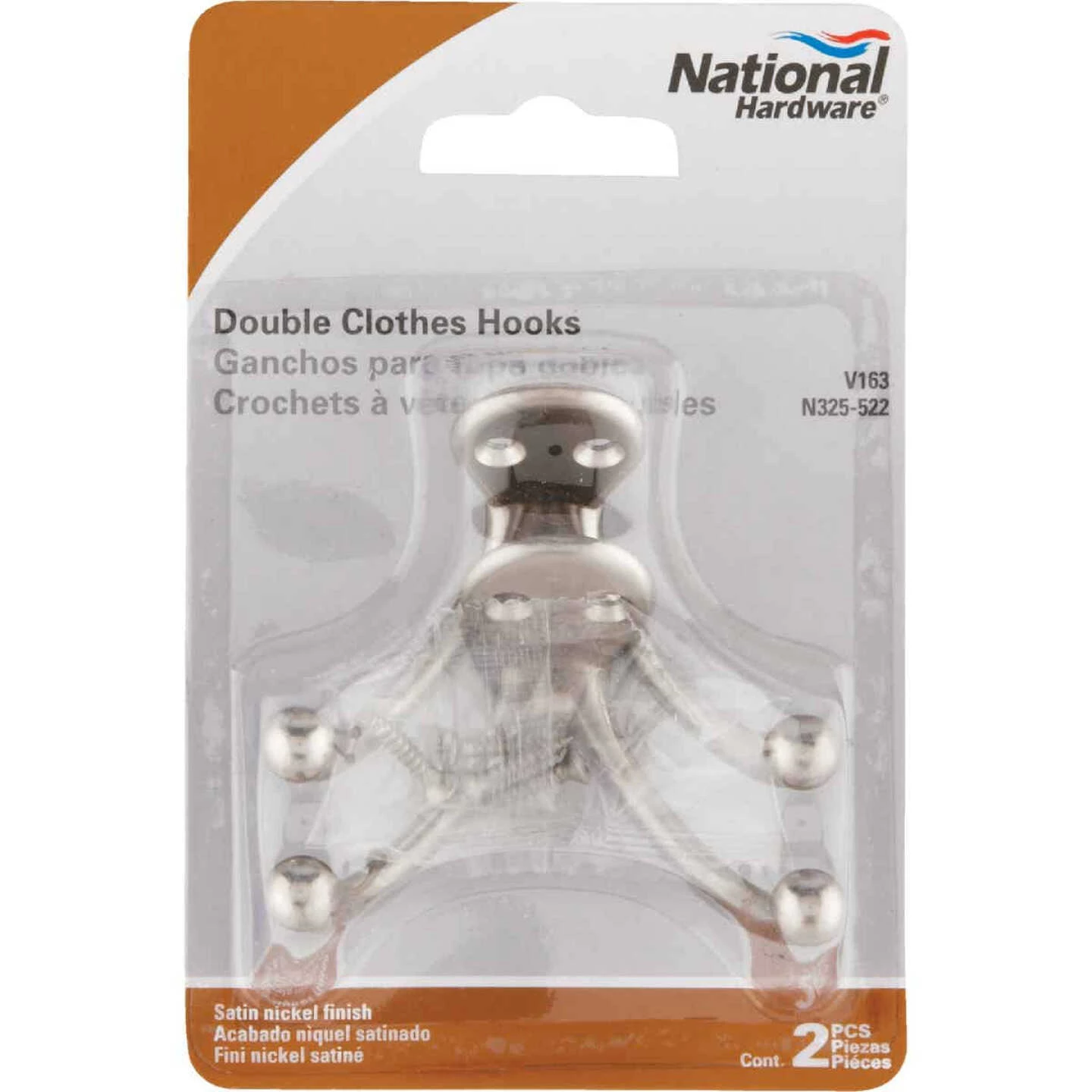 163 series. Double hook designed to mount on a door or wall to hold long and heavy garments. Decorative ball tip design. Zinc die-cast. Comes with 2 flat head wood screws (#6 x 3/4 In.) for installation.