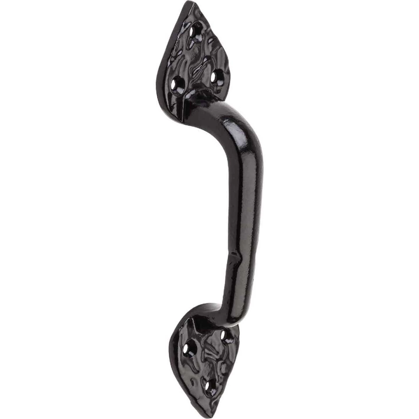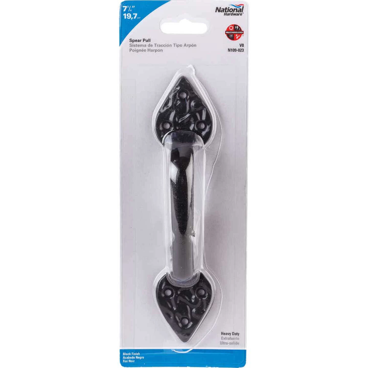 National catalog model No. V8 spear heavy-duty gate pull, black. Casted steel decorative spear design and with decorative material. Ornamental design for a variety of applications. Pull is ideal for gates, sheds and doors.