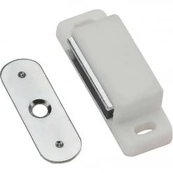 Reversible. Plastic case. Design allows magnet to pivot so that it will always center squarely on the metal strike for maximum holding strength. Magnet has approximately 13 lb. holding power. Includes screws.