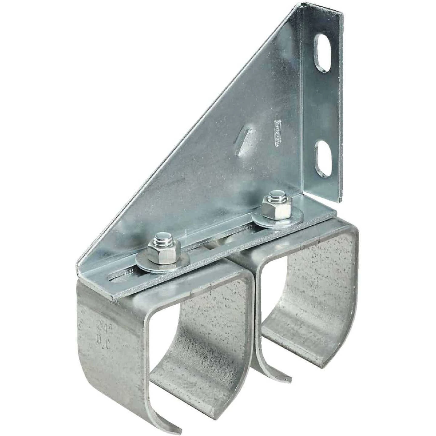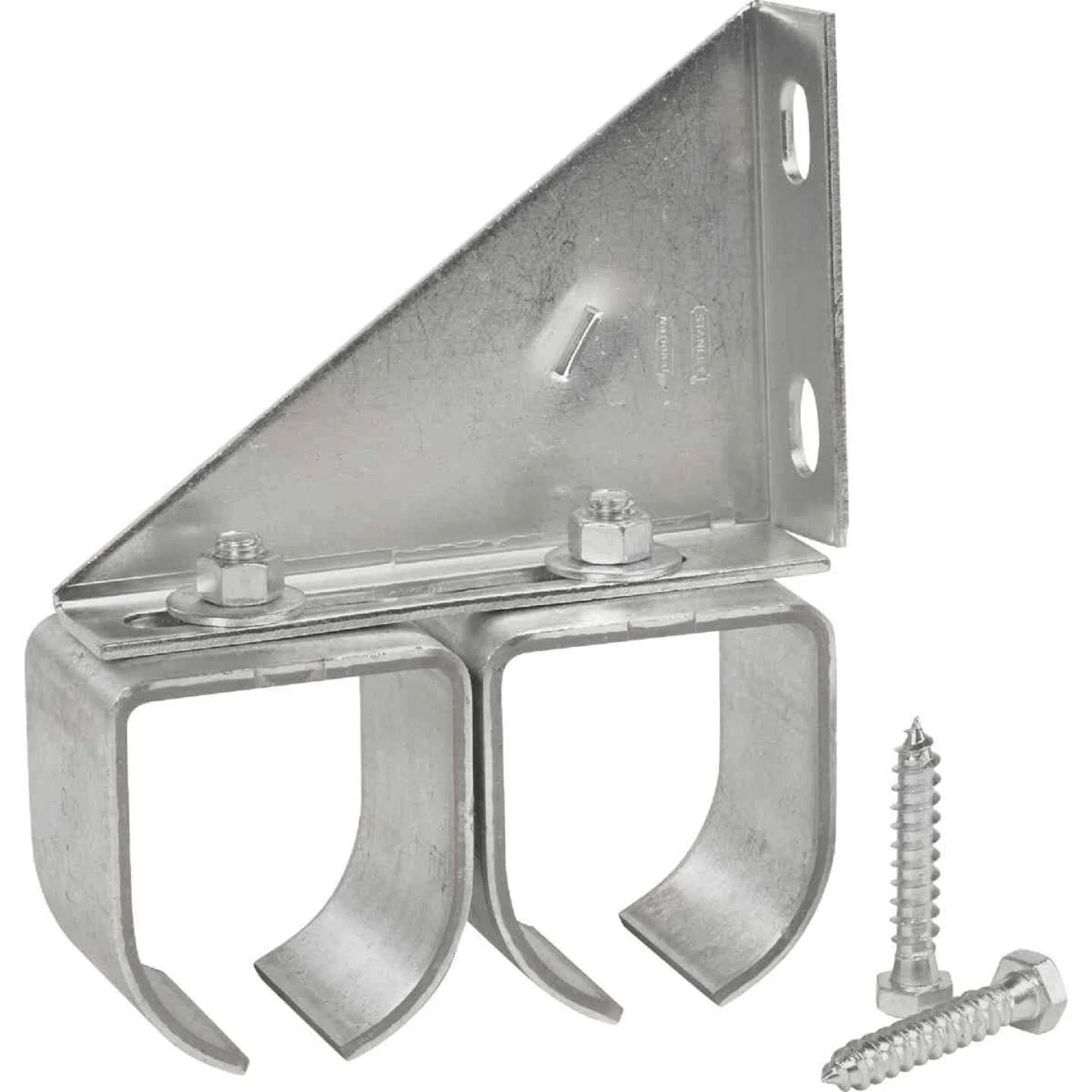 Adjustable double round rail bracket. Ideal for use on corrugated metal siding, adjustable to bring rail closer or further away from building. Includes lag bolt, 2 carriage bolts, and 2 nuts. 1 bracket should be installed every 2 Ft. of rail. WeatherGuard protection.