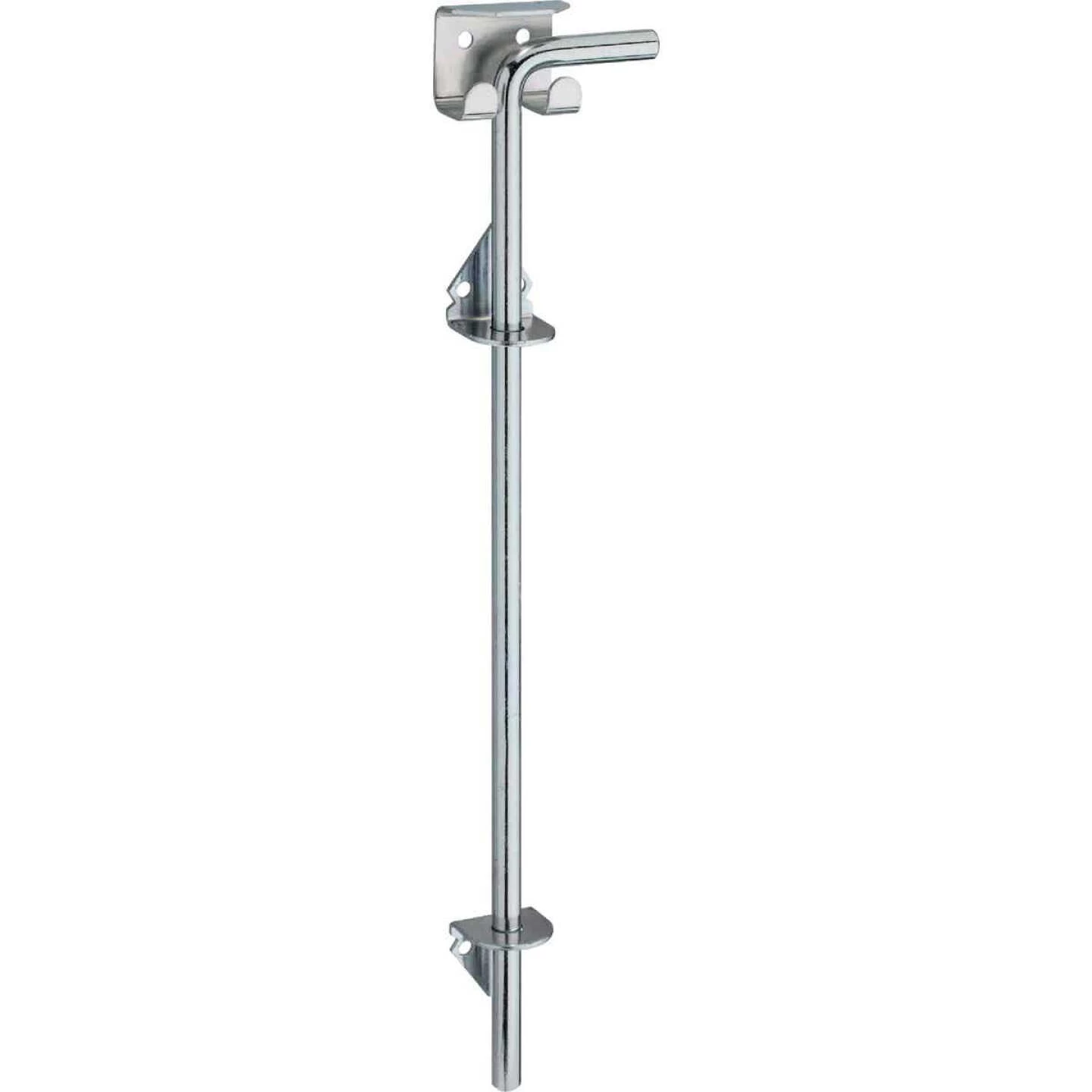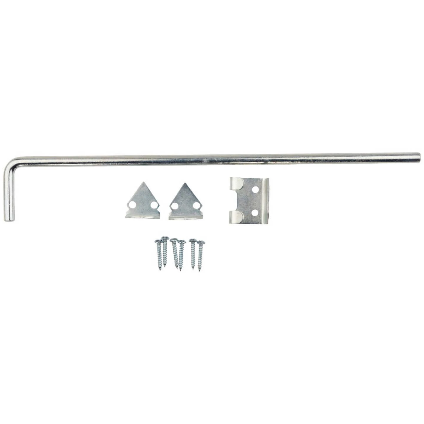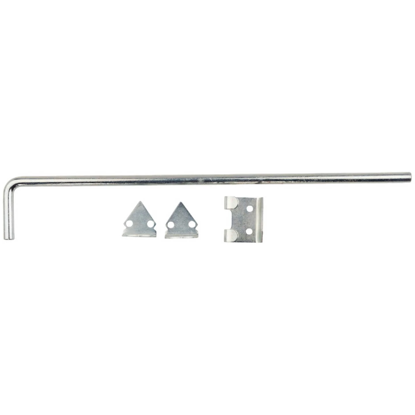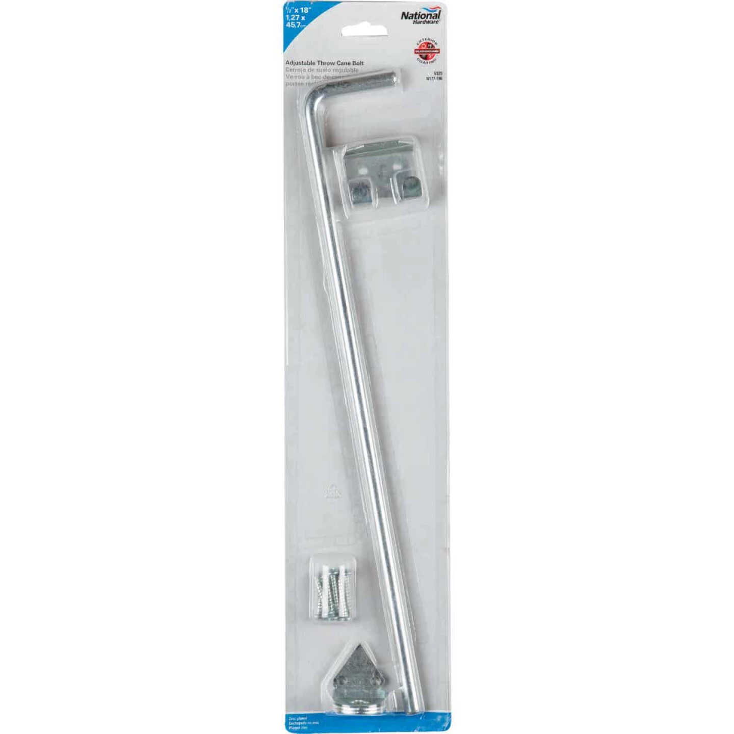 National catalog model No. V835 cane bolt. Designed for use on heavy wood gates and doors. Cane bolt anchors one gate while the gate latch acts as a stop for the other gate. Variable bolt throw and holder store bolt in open position and prevent its removal. Gate can be held in both the closed and open positions by using 2 sockets (1/2 In. or 3/4 In. pipe recommended but not included. Designed for vertical or horizontal applications. Manufactured from hot-rolled steel.