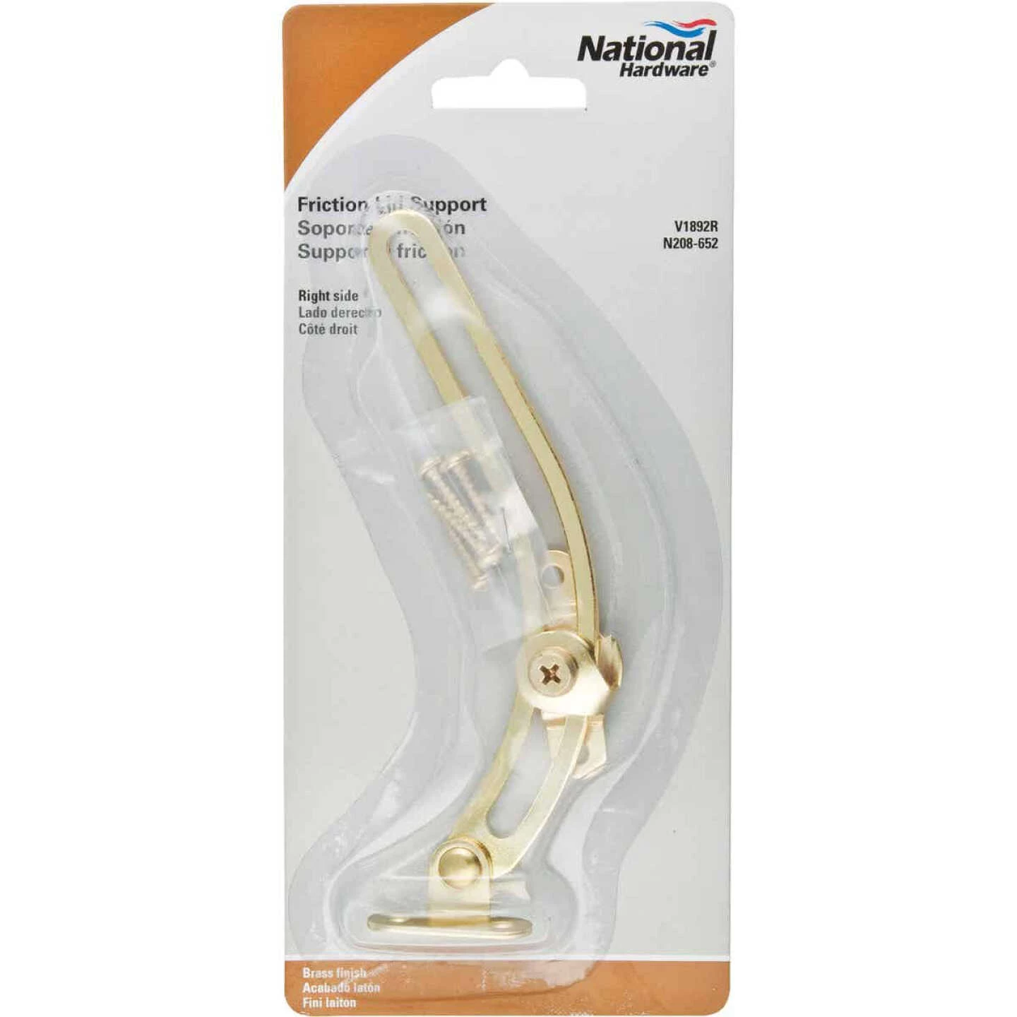 National catalog model No. V1892. Designed to support lids on shallow depth boxes, chests, etc., at least 2-1/2″ deep. Tension can be adjusted to hold lid in any position and to help prevent slamming. Made of steel. Brass finish. 1 per pack. Carded.