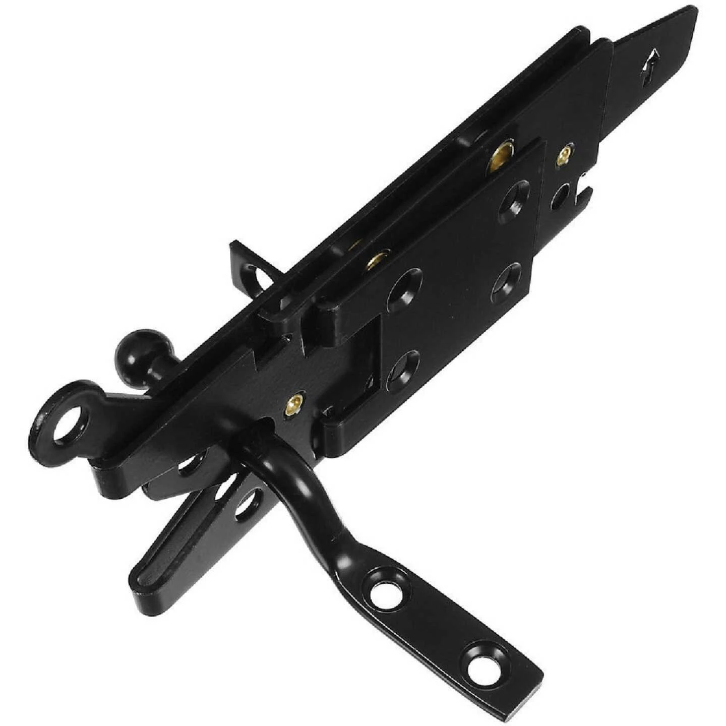 National catalog model No. V1138. The heavy-duty gate latch is designed for right or left handed applications. Latch can be released from either side of the gate. Self-latching. Can be padlocked for extra security. Mount to 2 sides of post. Heavy-duty gauge for long product life. Made of steel. 1 per pack. Carded. Black.